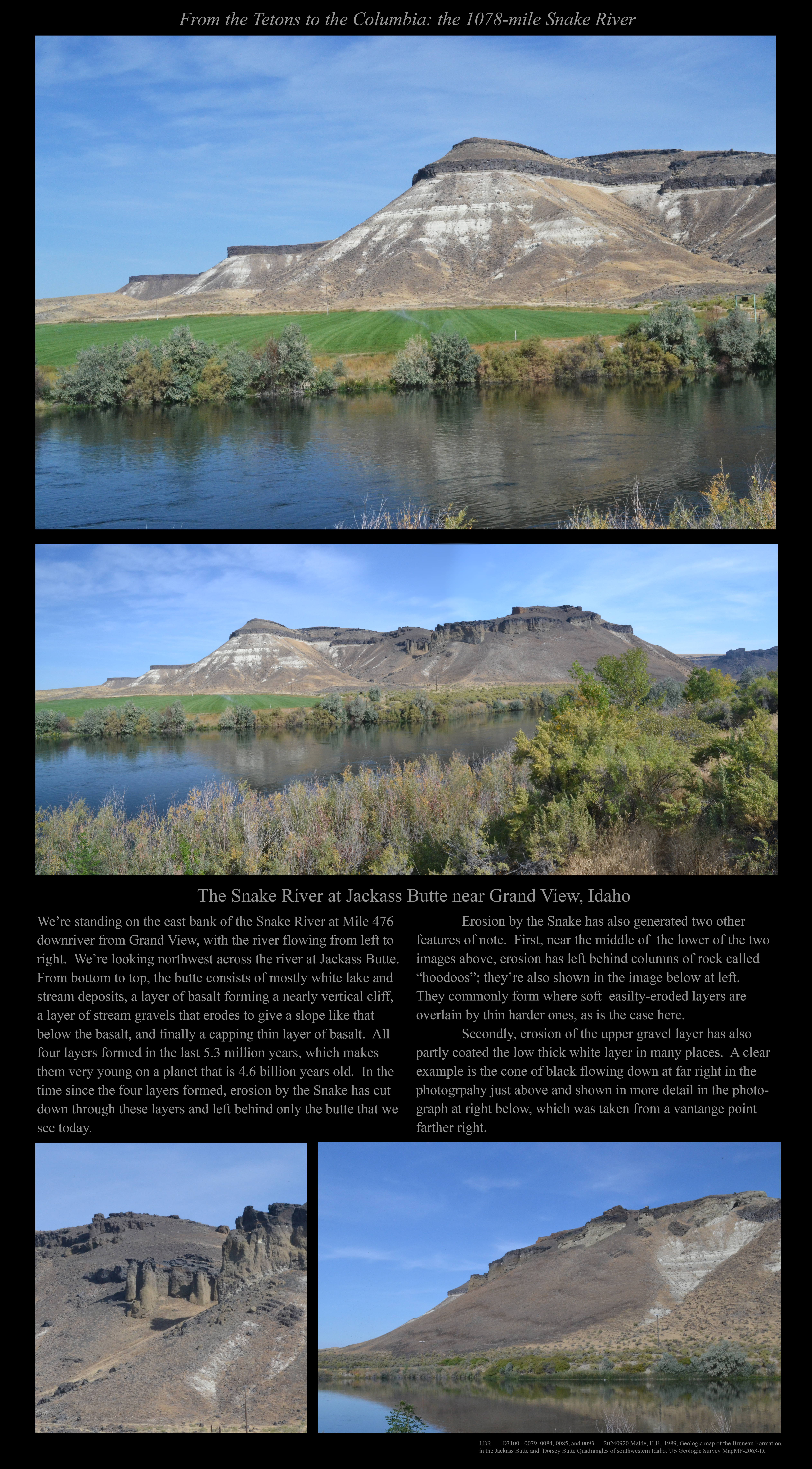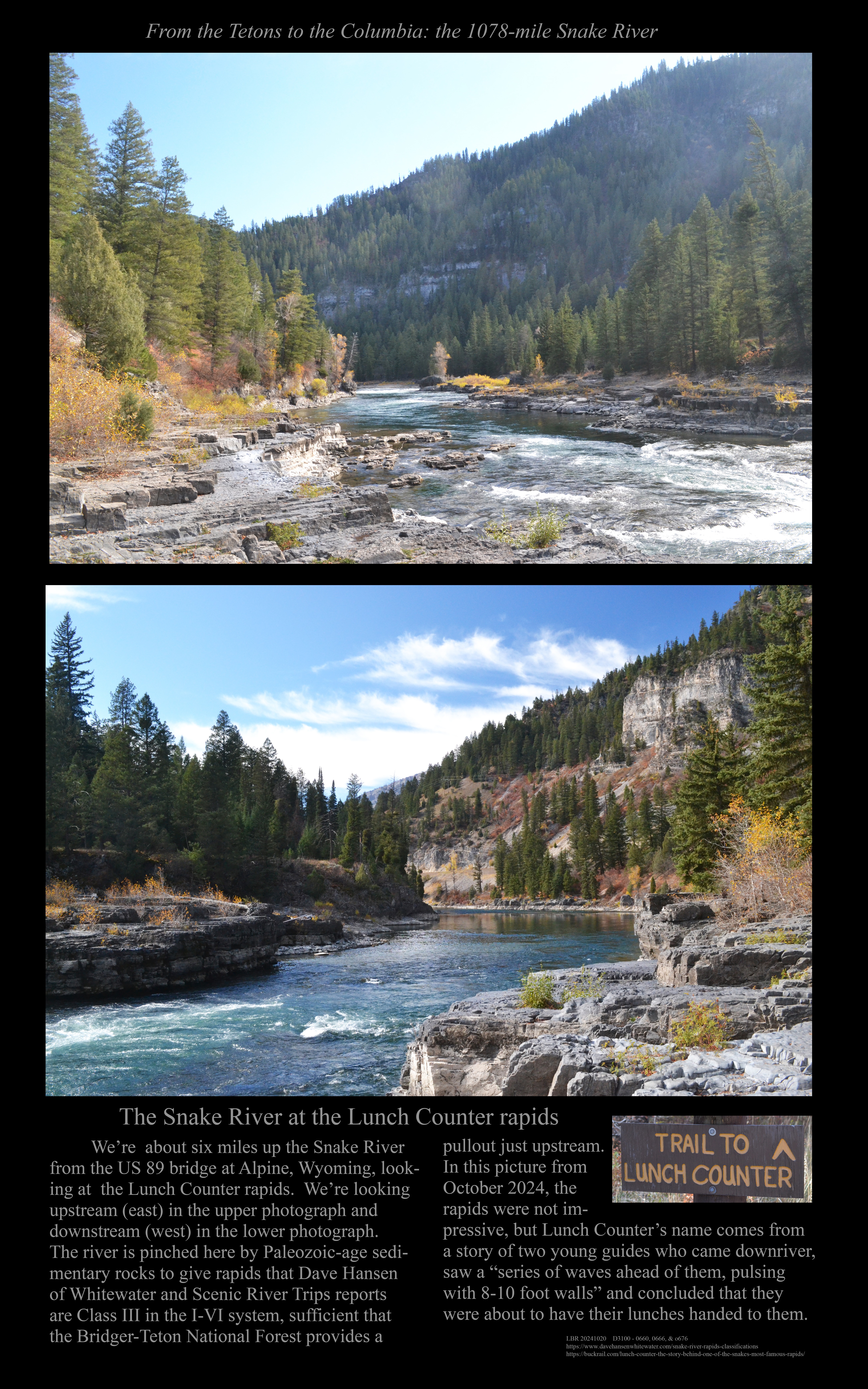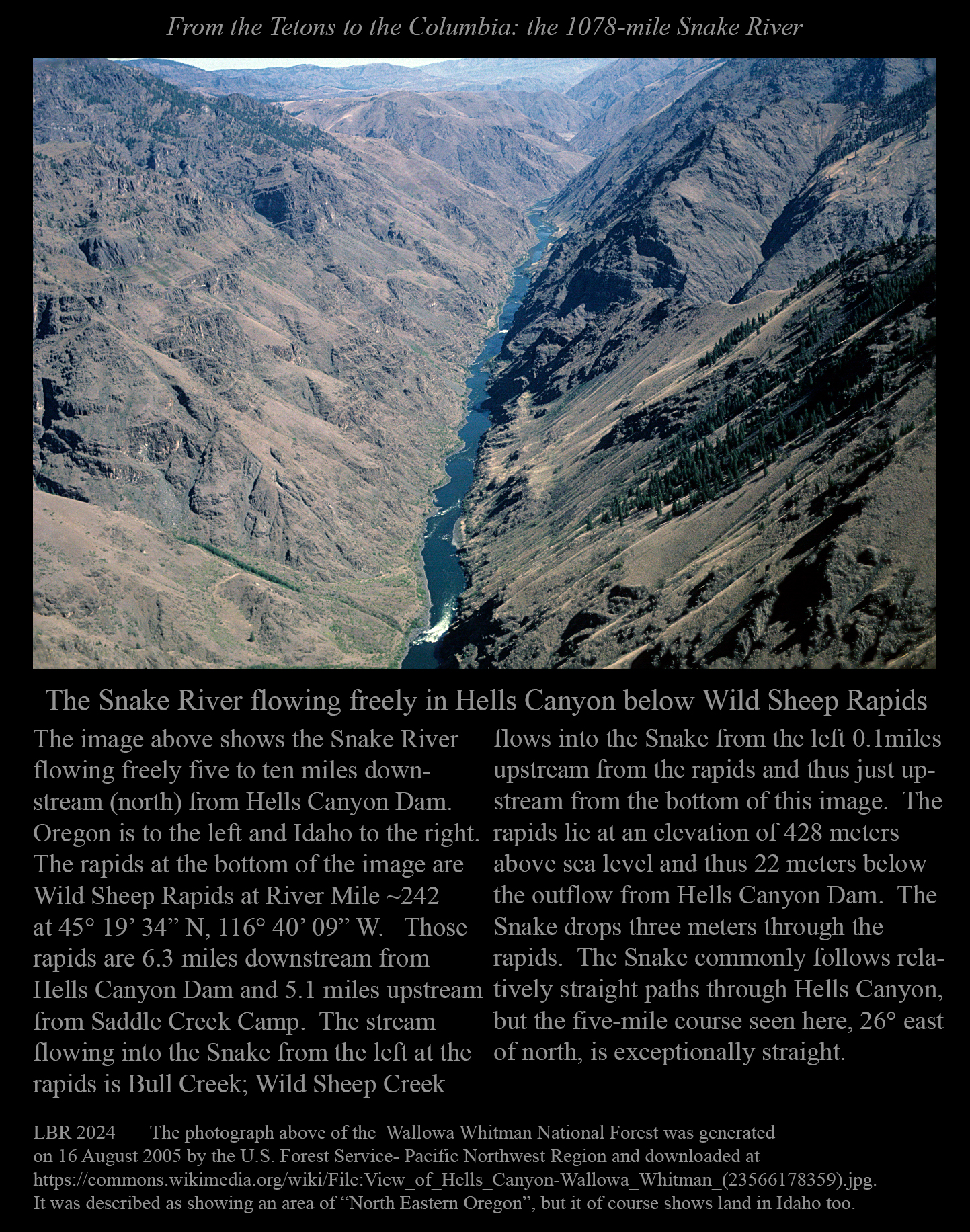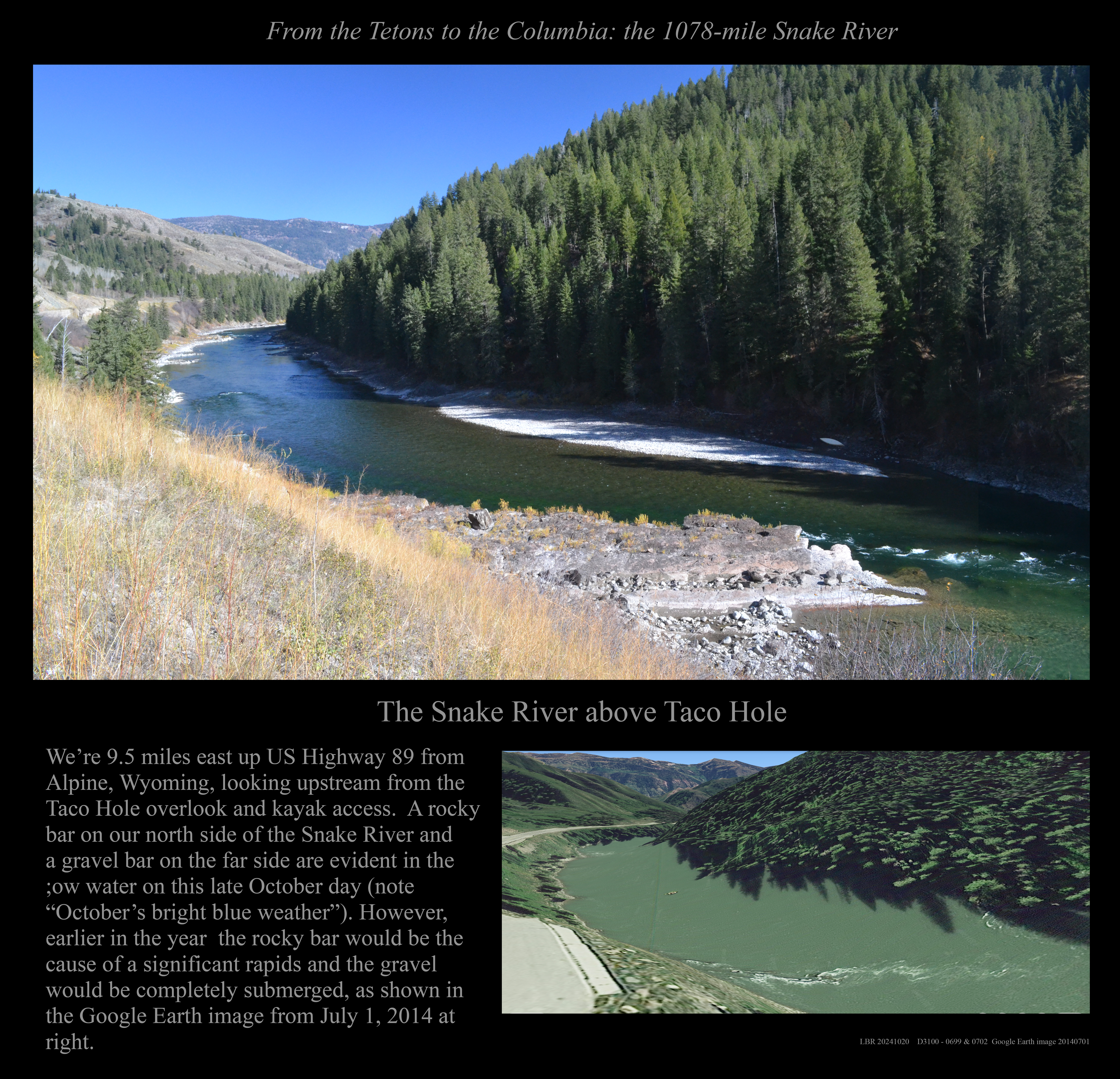 This is the early stage of a website intended to provide a photographic tour of the Snake River. The Snake extends from its headwaters in northwest Wyoming across southern Idaho, along the Oregon-Idaho and Washington-Idaho borders, and across eastern Washington to its confluence with the Columbia River. Pages/photographs are listed here in order from upstream to downstream, except as noted.
