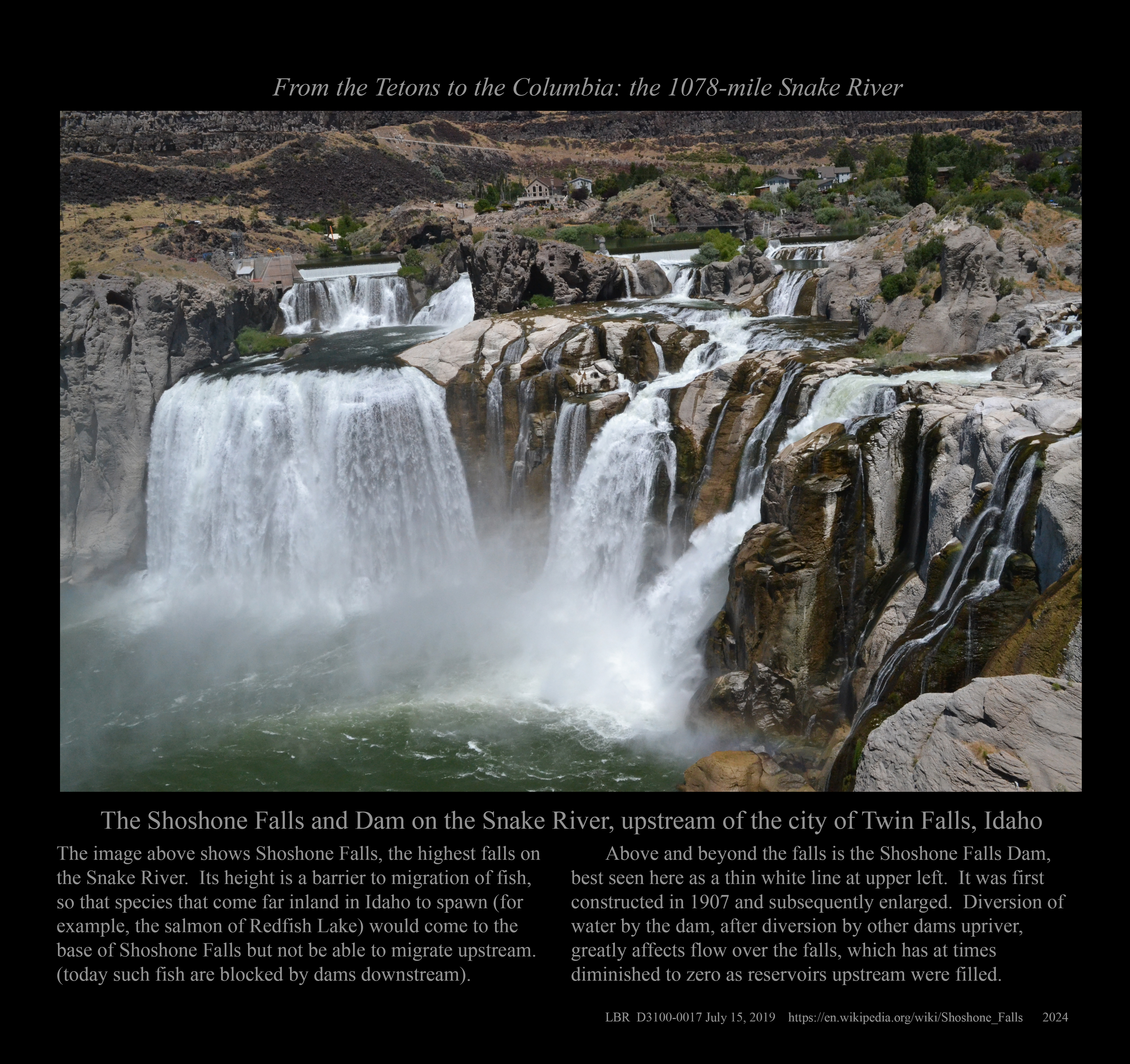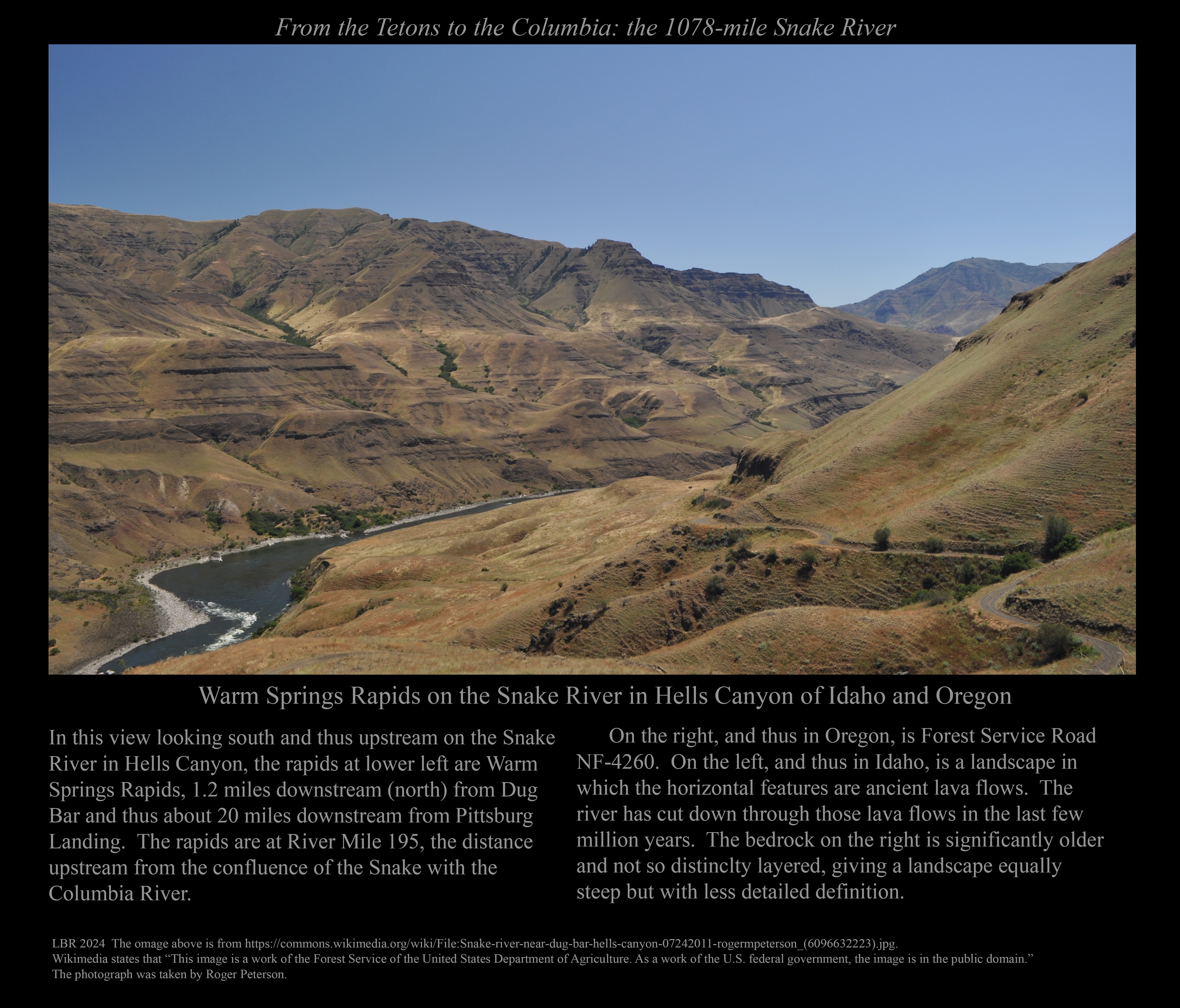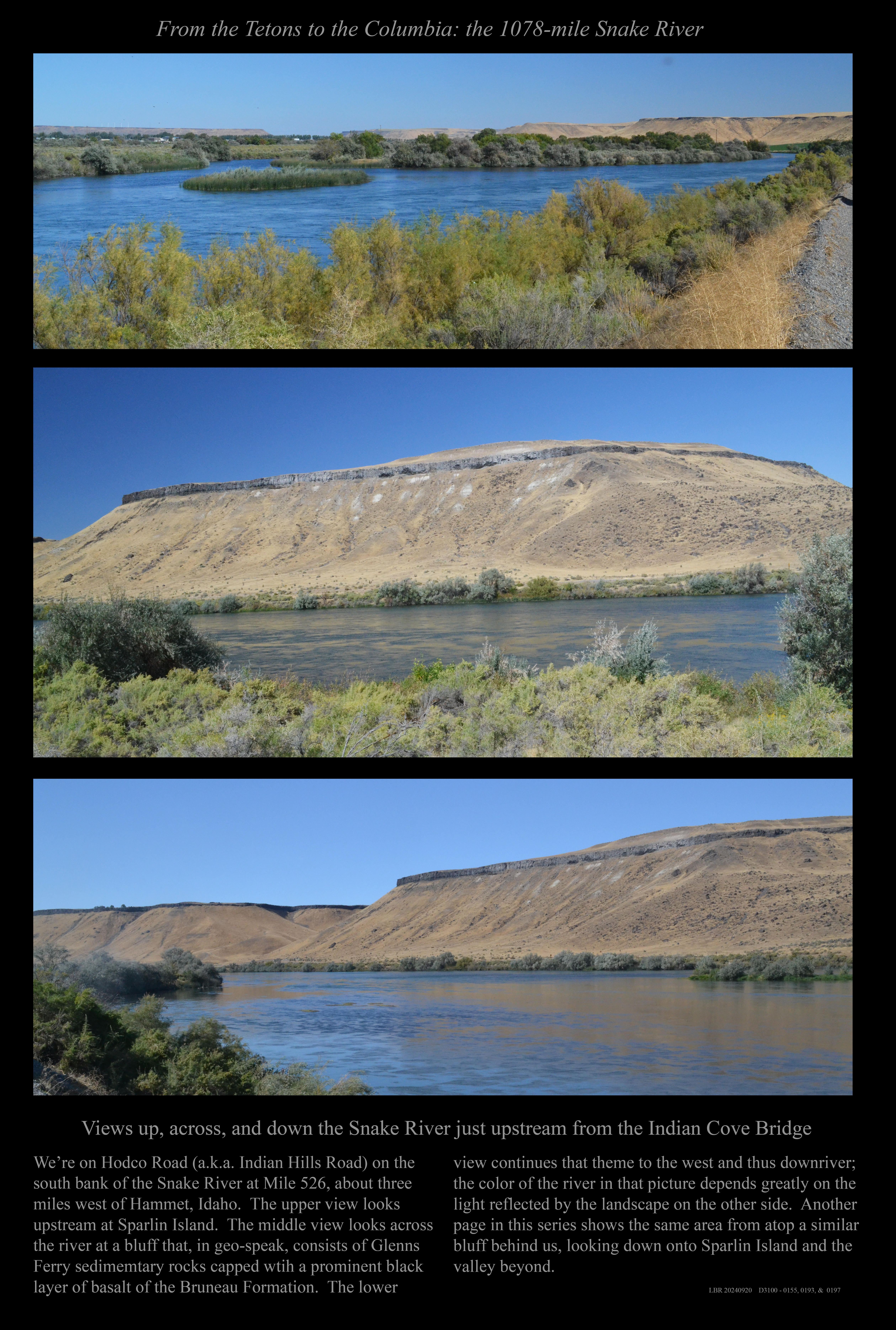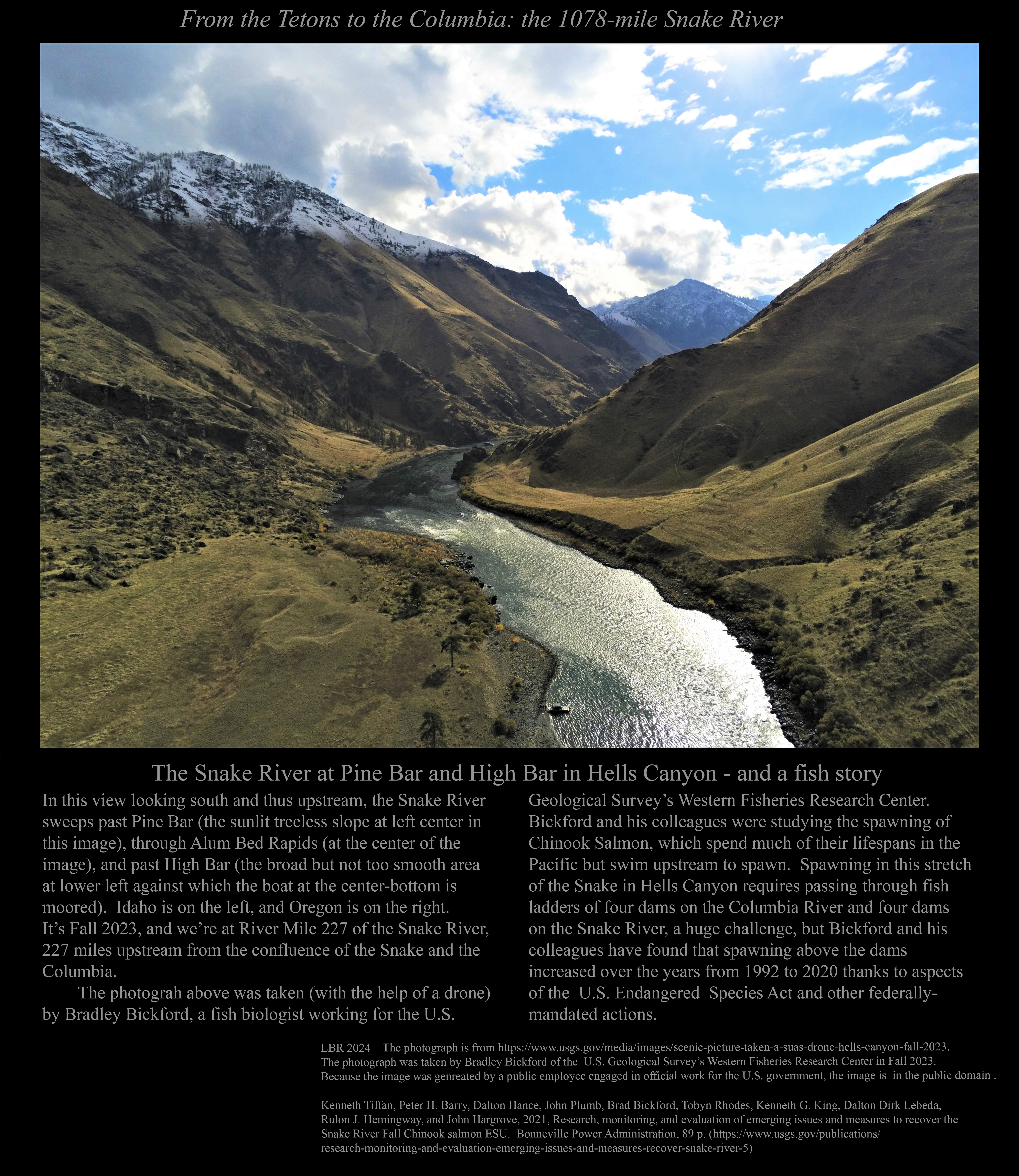 This is the early stage of a website intended to provide a photographic tour of the Snake River. The Snake extends from its headwaters in northwest Wyoming across southern Idaho, along the Oregon-Idaho and Washington-Idaho borders, and across eastern Washington to its confluence with the Columbia River. Pages/photographs are listed here in order from upstream to downstream, except as noted.