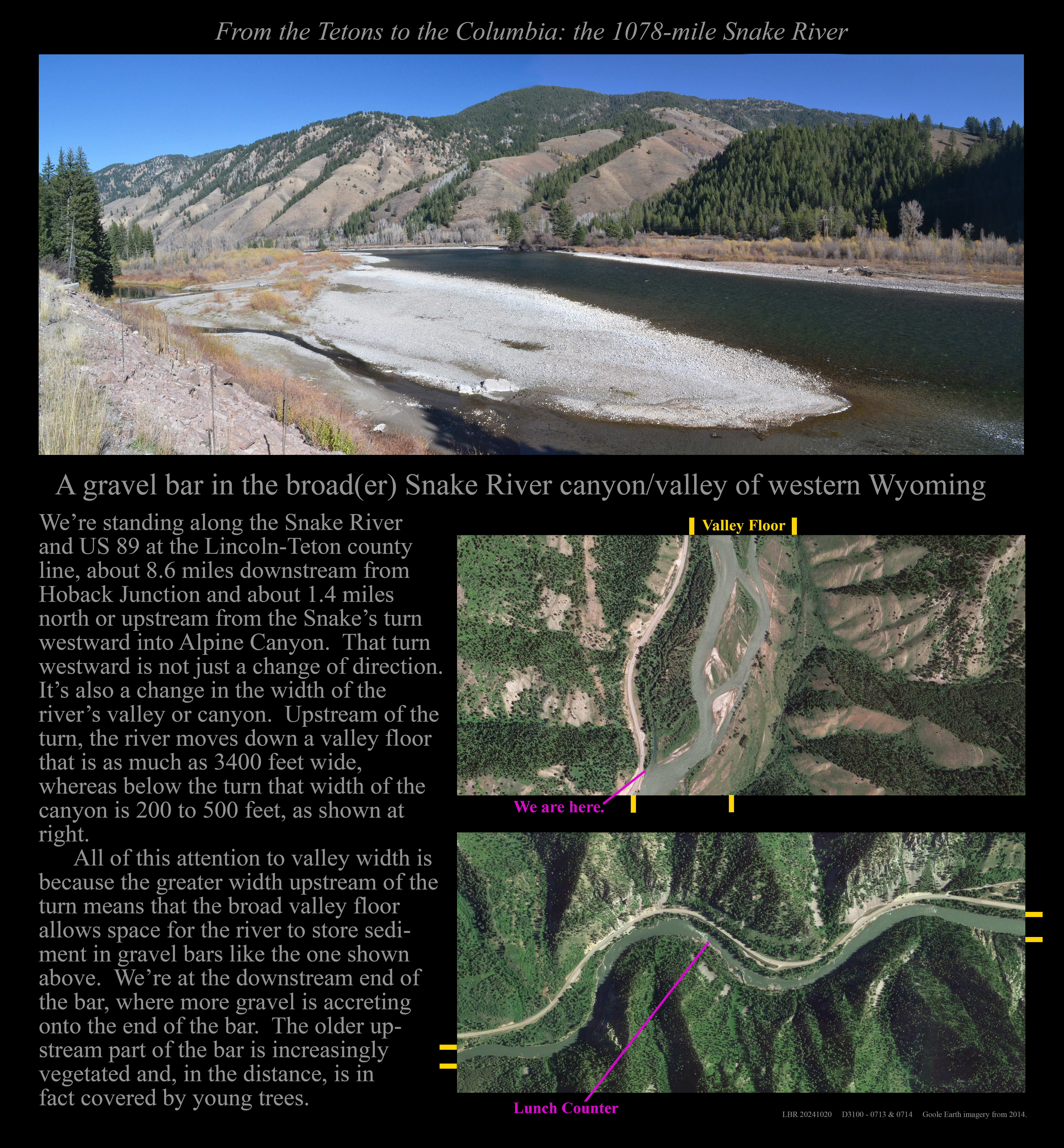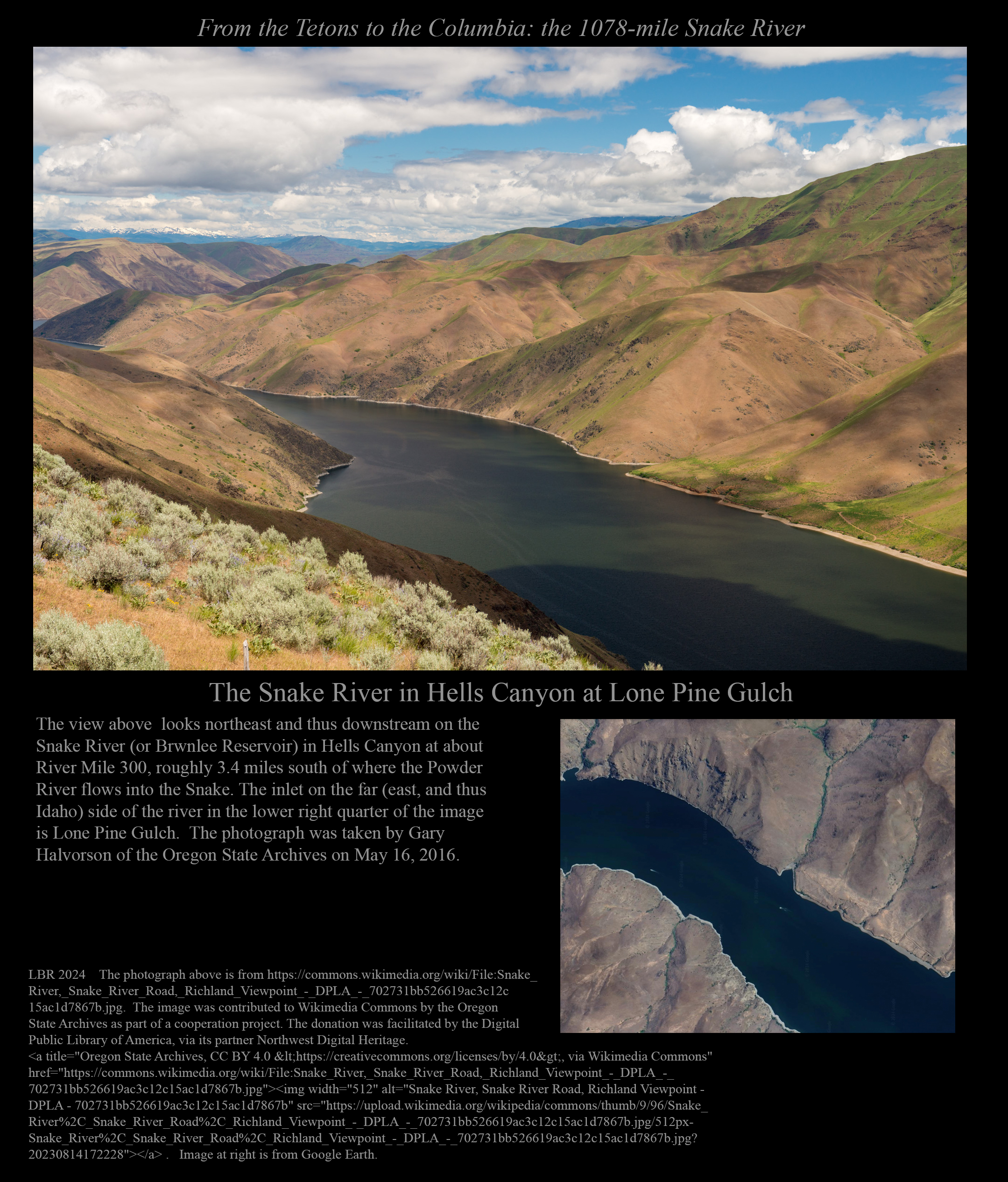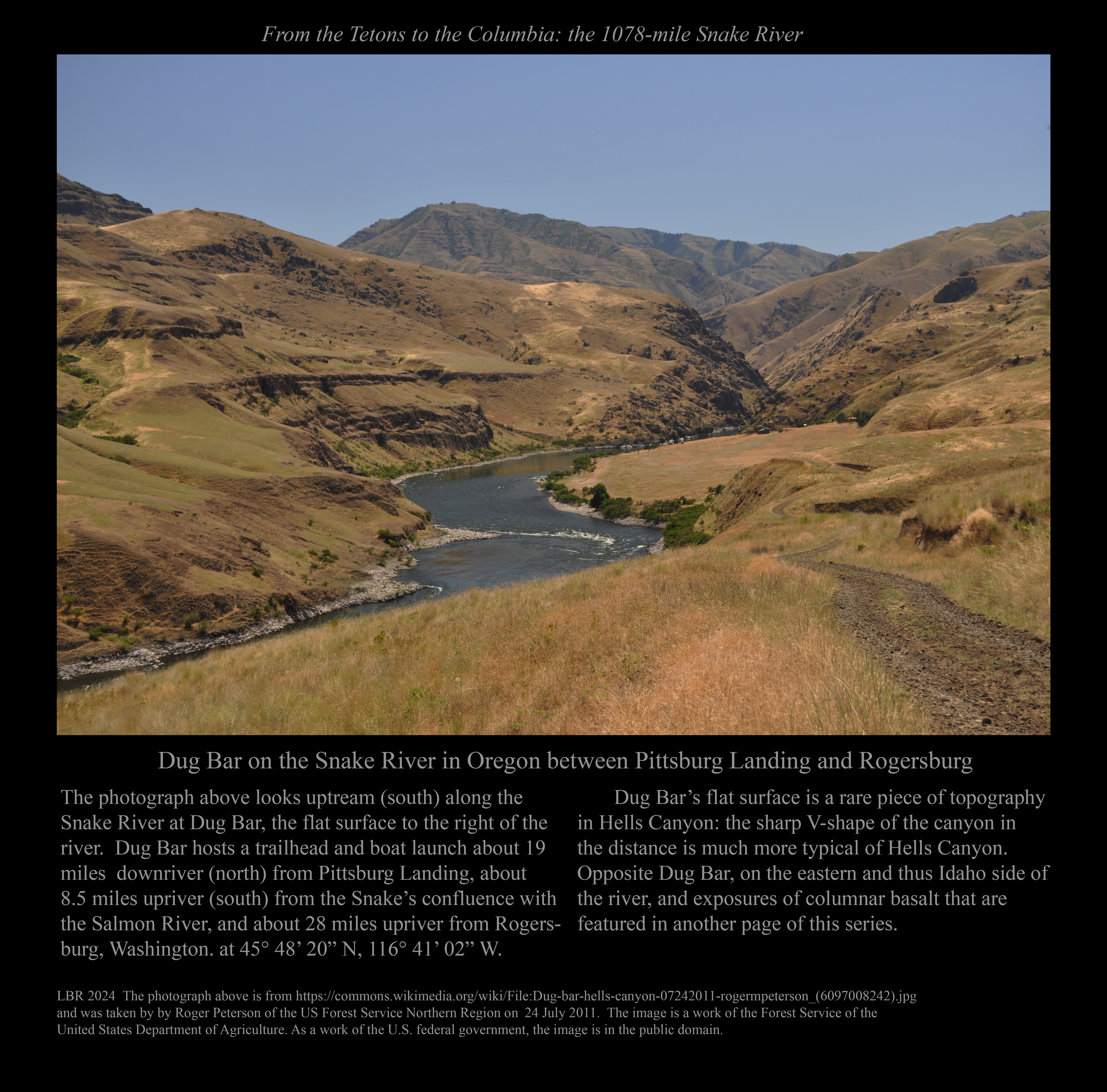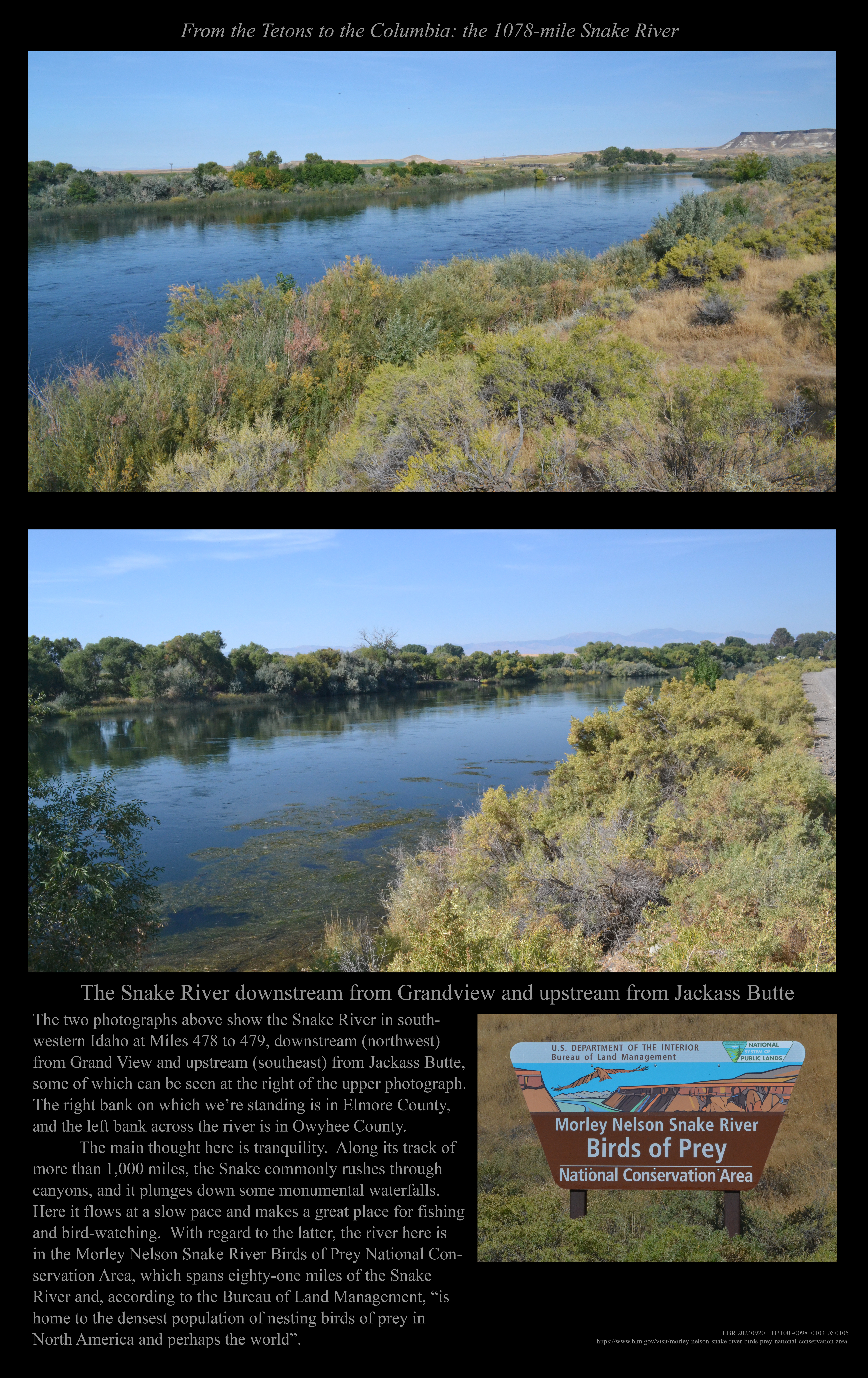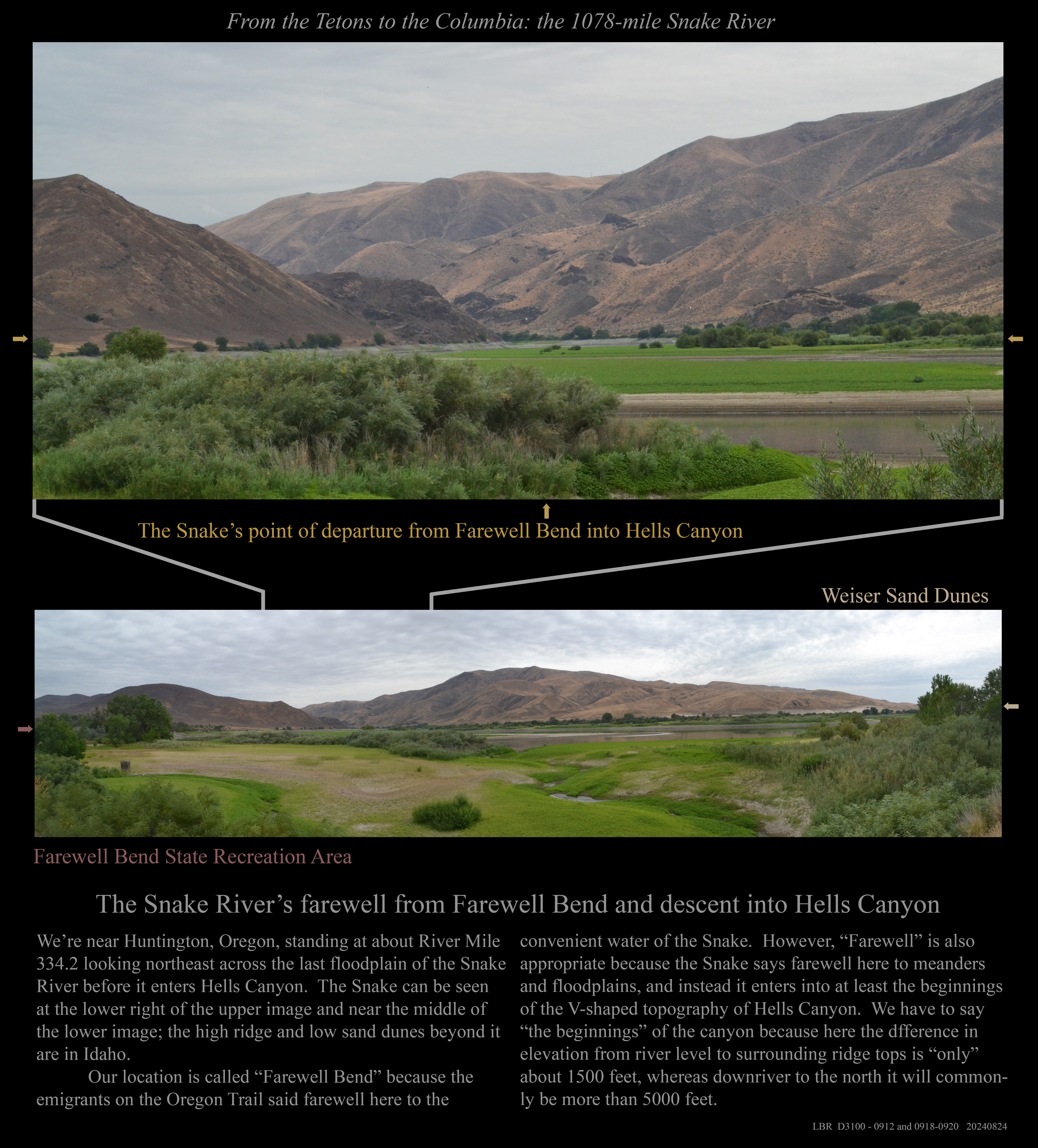 This is the early stage of a website intended to provide a photographic tour of the Snake River. The Snake extends from its headwaters in northwest Wyoming across southern Idaho, along the Oregon-Idaho and Washington-Idaho borders, and across eastern Washington to its confluence with the Columbia River. Pages/photographs are listed here in order from upstream to downstream, except as noted.