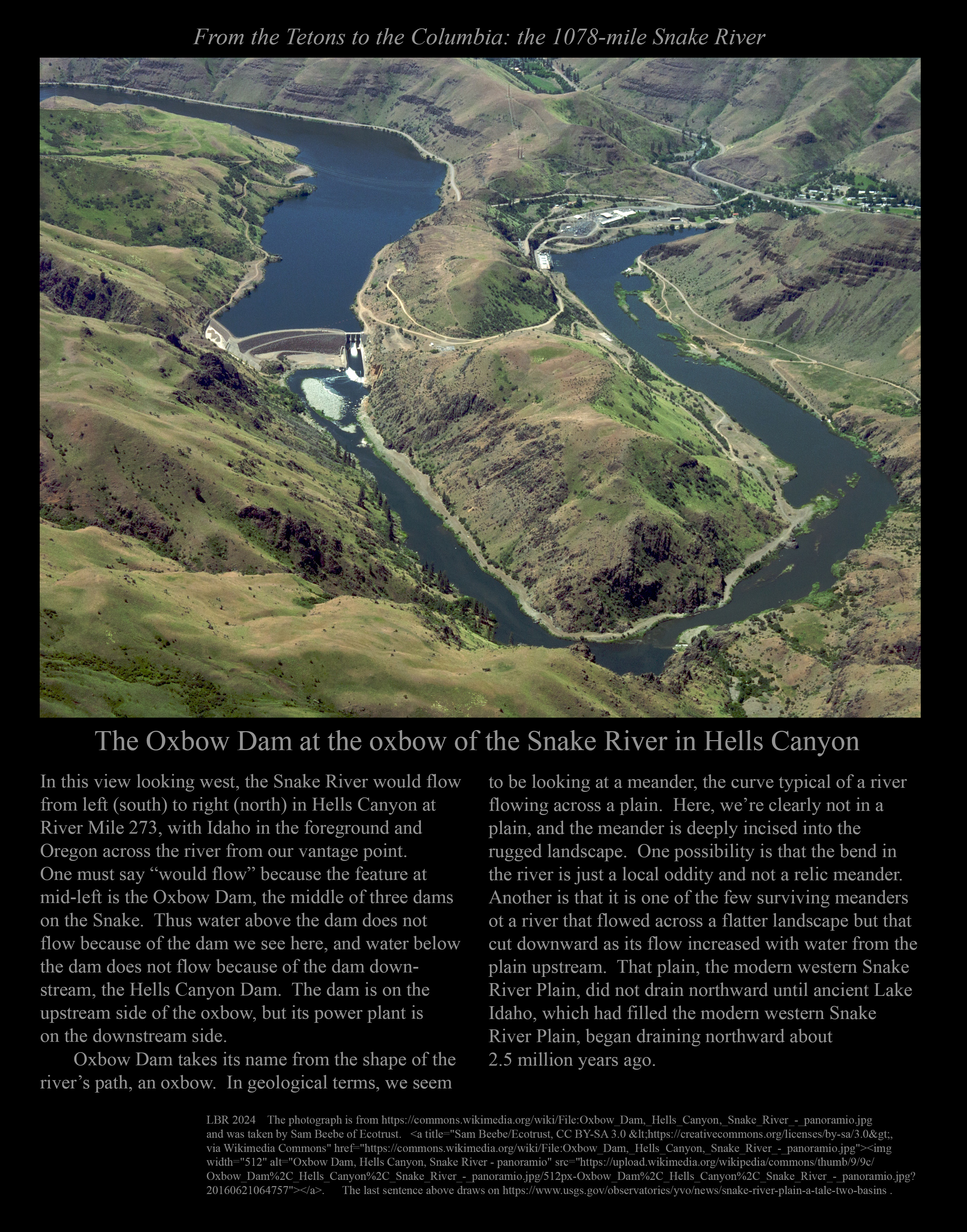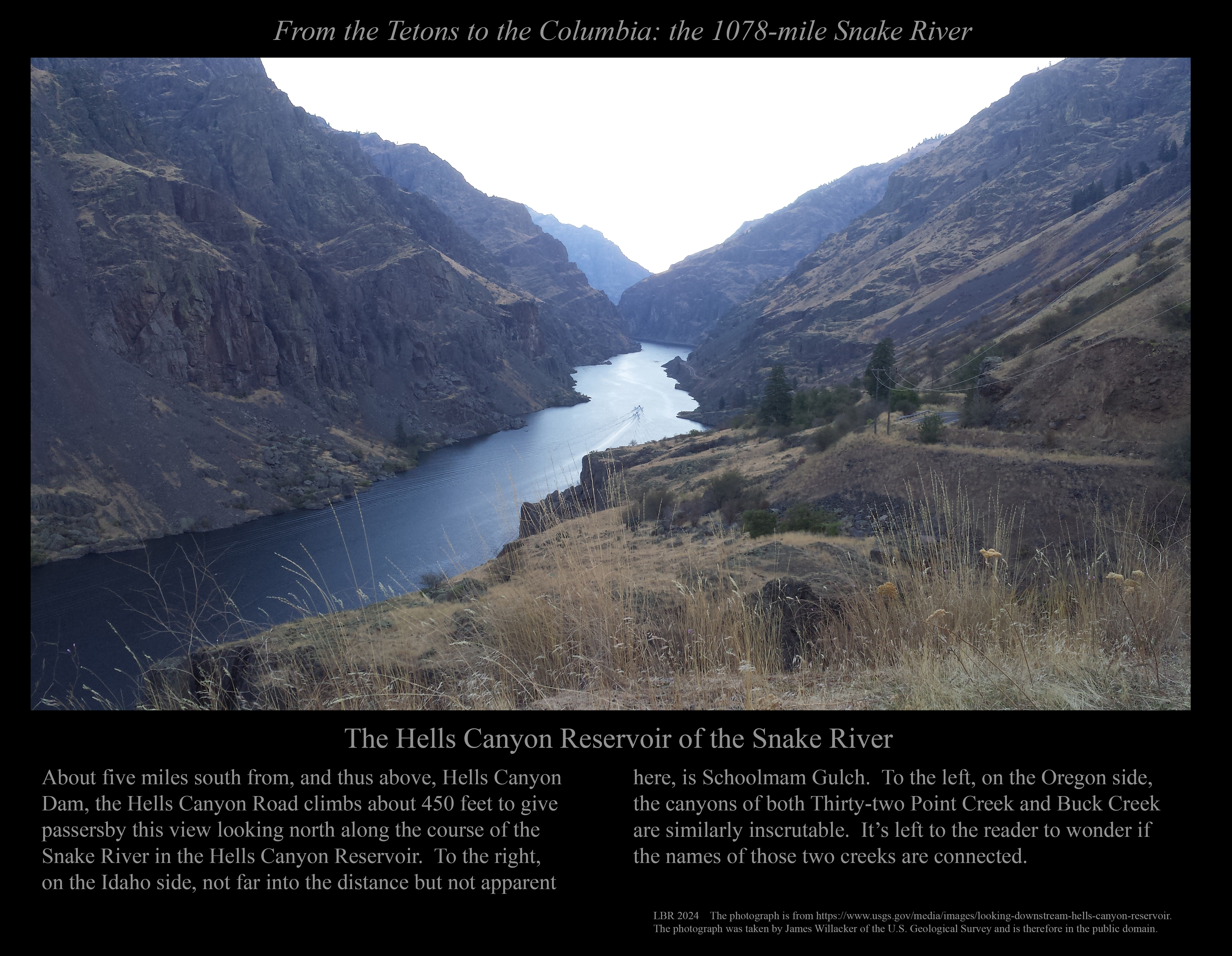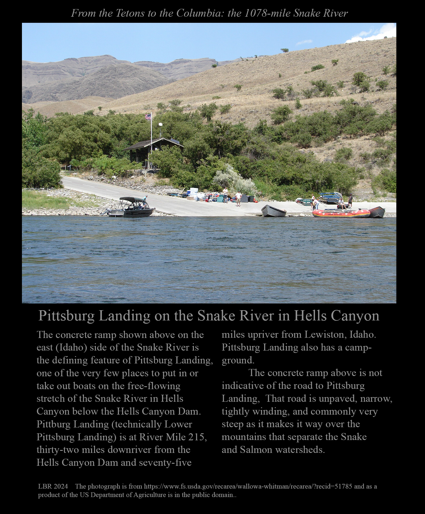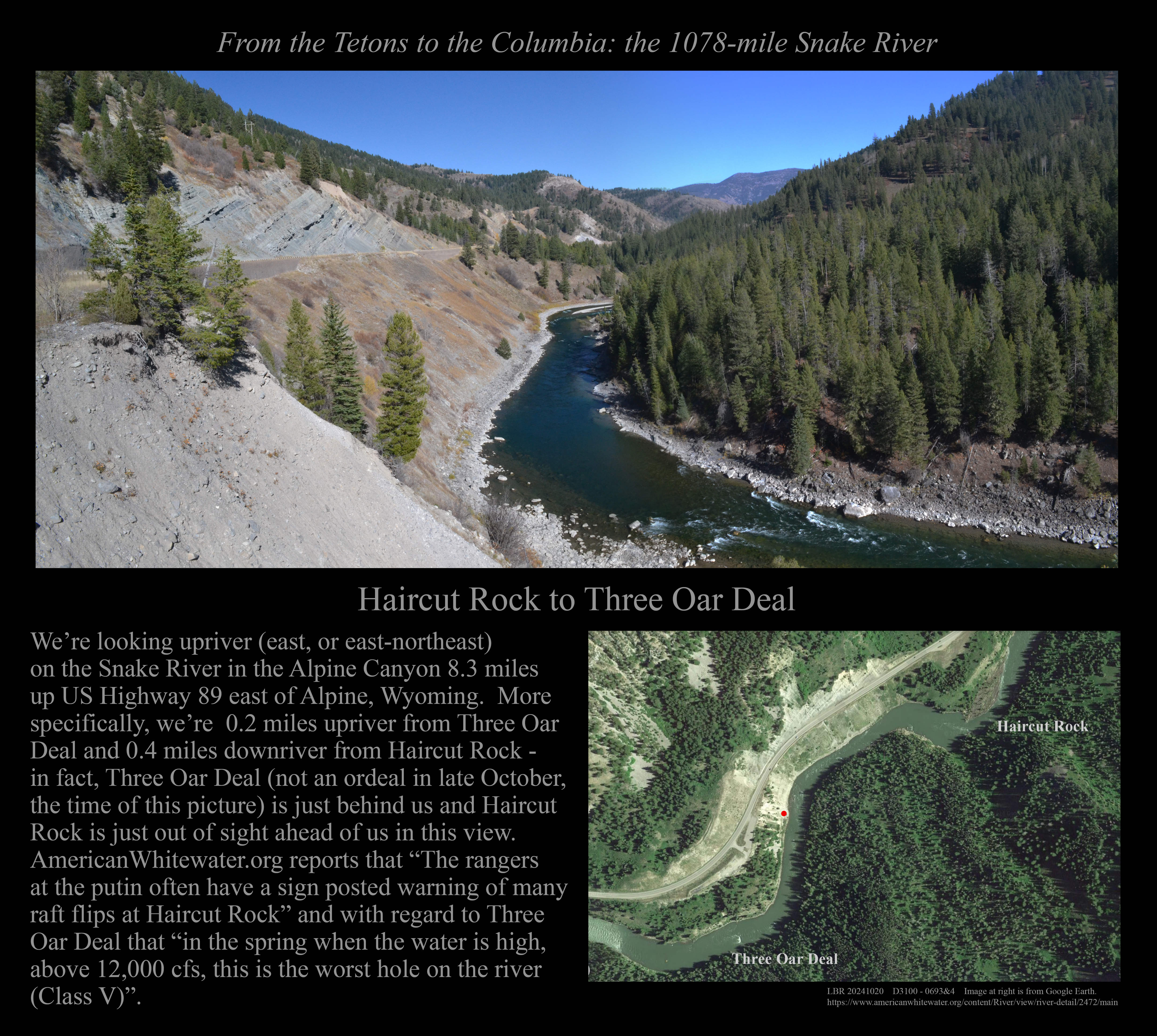 This is the early stage of a website intended to provide a photographic tour of the Snake River. The Snake extends from its headwaters in northwest Wyoming across southern Idaho, along the Oregon-Idaho and Washington-Idaho borders, and across eastern Washington to its confluence with the Columbia River. Pages/photographs are listed here in order from upstream to downstream, except as noted.