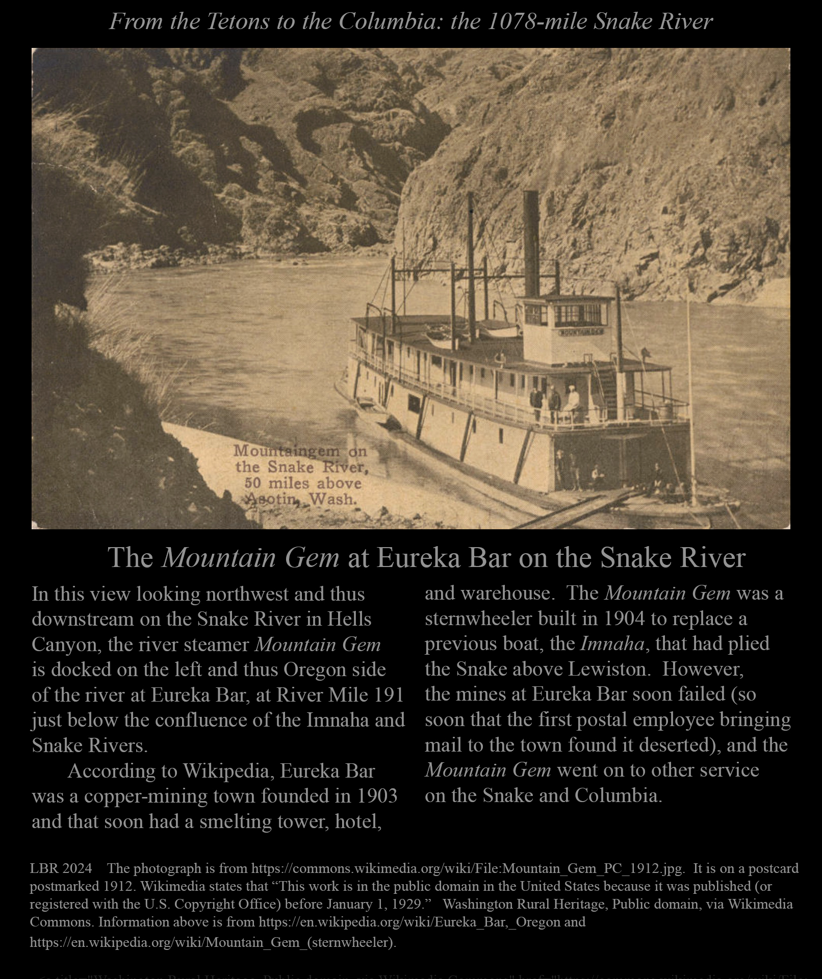 The Mountain Gem at Eureka Bar on the Snake River in the early 1900s.